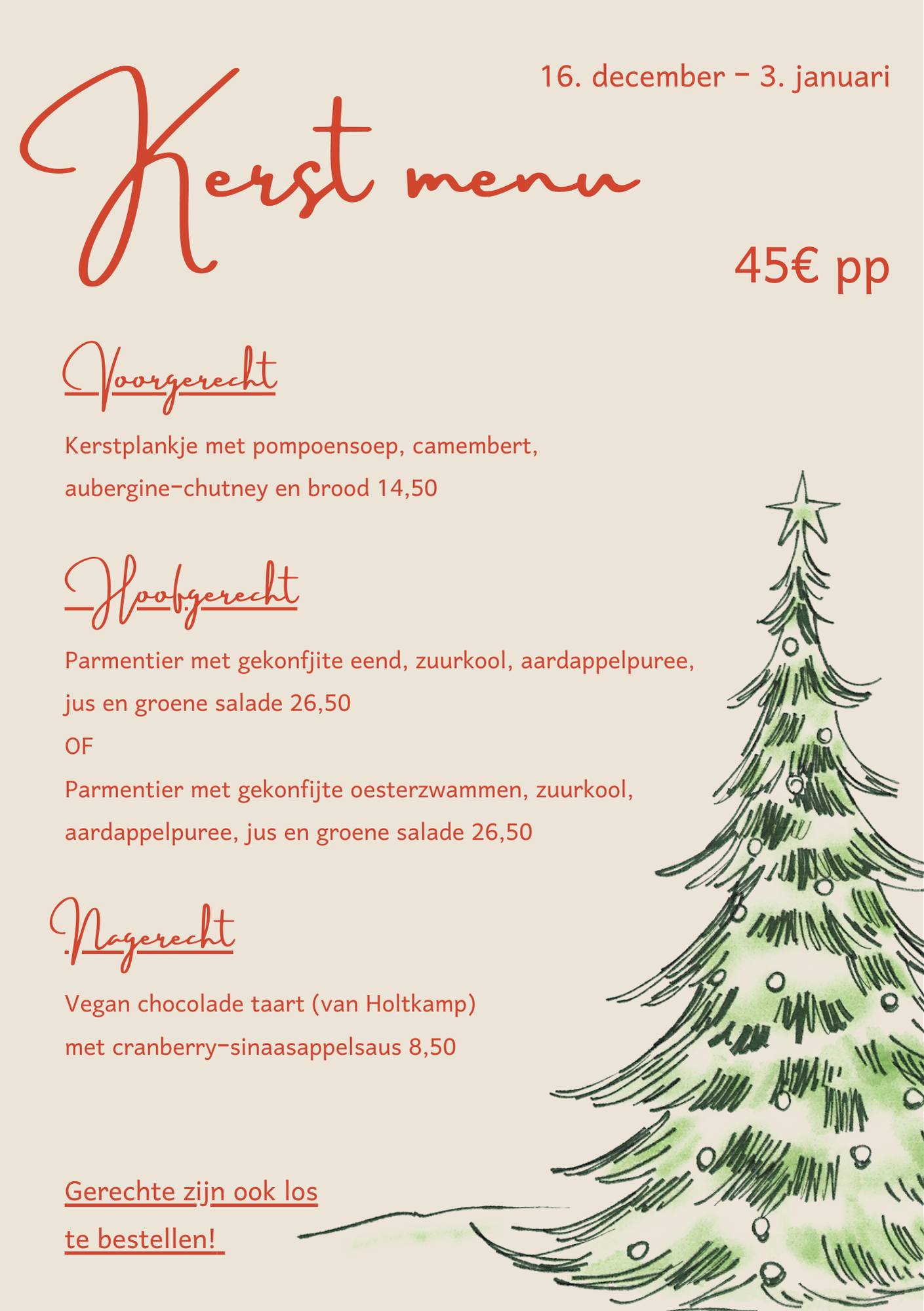 Van 16 december tot 3 januari serveren we een feestelijke 3-gangen kerstmenu - zie hieronder!